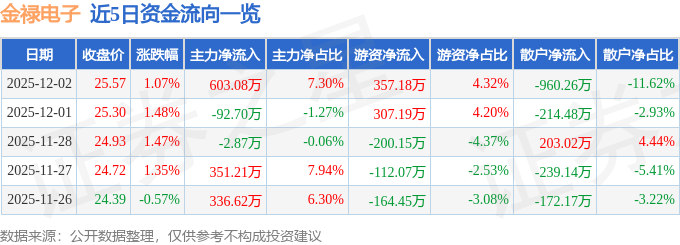 证券之星消息,截至2025年12月2日收盘,金禄电子(301282)报收于25.57元,上涨1.07%,换手率4.07%,成交量3.24万手,成交额8265.51万元。