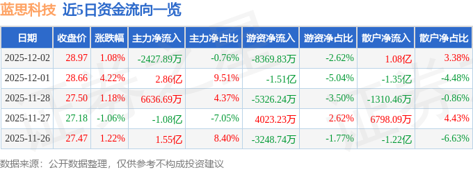 证券之星消息,截至2025年12月2日收盘,蓝思科技(300433)报收于28.97元,上涨1.08%,换手率2.2%,成交量109.5万手,成交额31.98亿元。