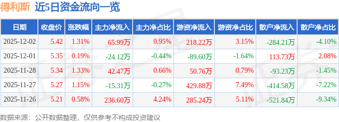 12月2日的资金流向数据方面,主力资金净流入65.99万元,占总成交额0.95%,游资资金净流入218.22万元,占总成交额3.15%,散户资金净流出284.21万元,占总成交额4.1%。