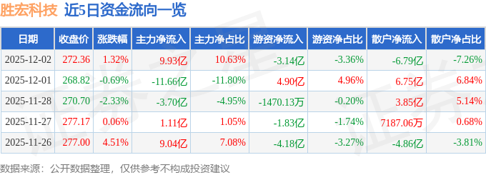 证券之星消息,截至2025年12月2日收盘,胜宏科技(300476)报收于272.36元,上涨1.32%,换手率3.98%,成交量34.08万手,成交额93.41亿元。