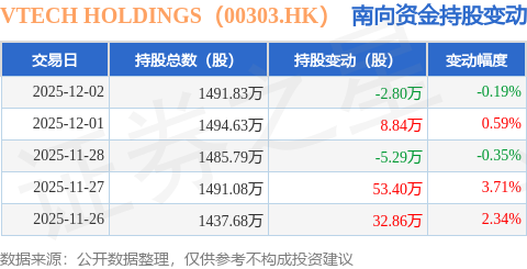 证券之星消息,12月2日南向资金减持2.8万股VTECH HOLDINGS(00303.HK)。近5个交易日中,获南向资金增持的有3天,累计净增持87.01万股。近20个交易日中,获南向资金增持的有17天,累计净增持92.21万股。截至目前,南向资金持有VTECH HOLDINGS(00303.HK)1491.83万股,占公司已发行普通股的5.88%。