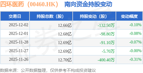 证券之星消息,12月2日南向资金减持132.5万股四环医药(00460.HK)。近5个交易日中,获南向资金减持的有5天,累计净减持728.5万股。近20个交易日中,获南向资金减持的有16天,累计净减持5278.4万股。截至目前,南向资金持有四环医药(00460.HK)12.66亿股,占公司已发行普通股的13.57%。