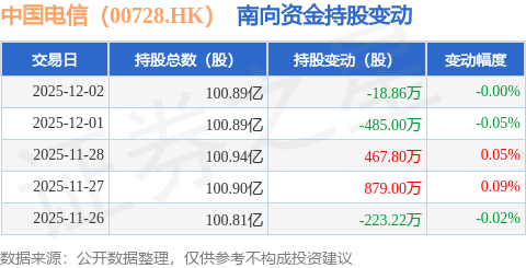 证券之星消息,12月2日南向资金减持18.86万股中国电信(00728.HK)。近5个交易日中,获南向资金增持的有2天,累计净增持619.72万股。近20个交易日中,获南向资金增持的有16天,累计净增持2.11亿股。截至目前,南向资金持有中国电信(00728.HK)100.89亿股,占公司已发行普通股的72.69%。