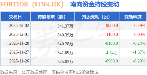 证券之星消息,12月2日南向资金增持9800.0股FORTIOR(01304.HK)。近5个交易日中,获南向资金减持的有3天,累计净减持5.15万股。近20个交易日中,获南向资金增持的有12天,累计净增持20.99万股。截至目前,南向资金持有FORTIOR(01304.HK)341.37万股,占公司已发行普通股的15.83%。