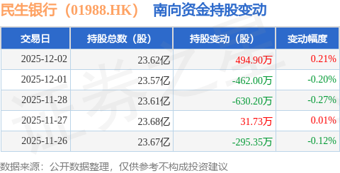 证券之星消息,12月2日南向资金增持494.9万股民生银行(01988.HK)。近5个交易日中,获南向资金减持的有3天,累计净减持860.92万股。近20个交易日中,获南向资金减持的有13天,累计净减持2955.59万股。截至目前,南向资金持有民生银行(01988.HK)23.62亿股,占公司已发行普通股的28.38%。