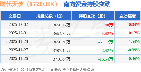 证券之星消息,12月2日南向资金增持1.4万股时代天使(06699.HK)。近5个交易日中,获南向资金减持的有3天,累计净减持68.26万股。近20个交易日中,获南向资金减持的有13天,累计净减持102.87万股。截至目前,南向资金持有时代天使(06699.HK)3656.12万股,占公司已发行普通股的21.4%。