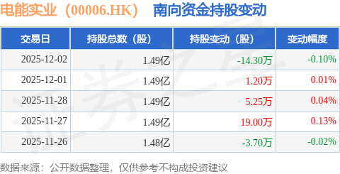 证券之星消息,12月2日南向资金减持14.3万股电能实业(00006.HK)。近5个交易日中,获南向资金增持的有3天,累计净增持7.45万股。近20个交易日中,获南向资金增持的有16天,累计净增持210.15万股。截至目前,南向资金持有电能实业(00006.HK)1.49亿股,占公司已发行普通股的6.97%。