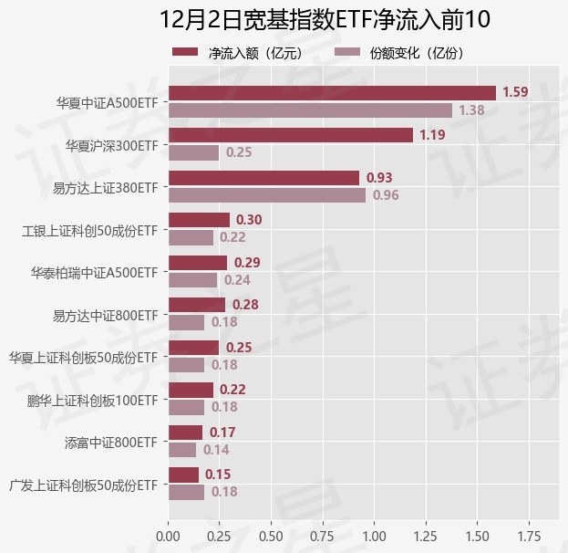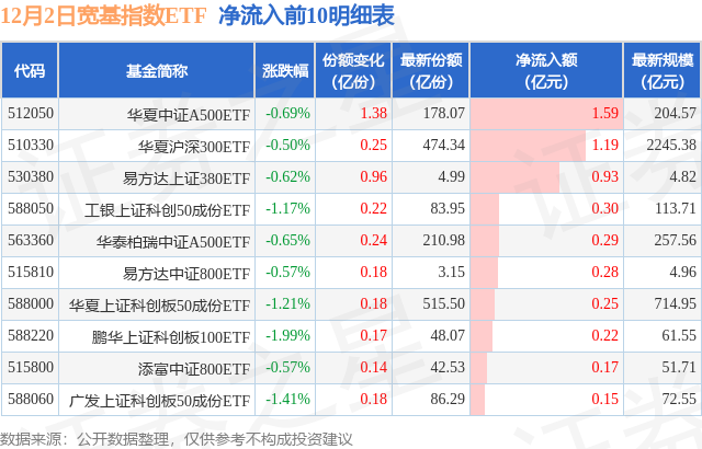 当日有25只宽基指数ETF基金出现资金净流入,其中净流入排首位的是华夏中证A500ETF(512050),份额增加了1.38亿份,净流入额为1.59亿元。