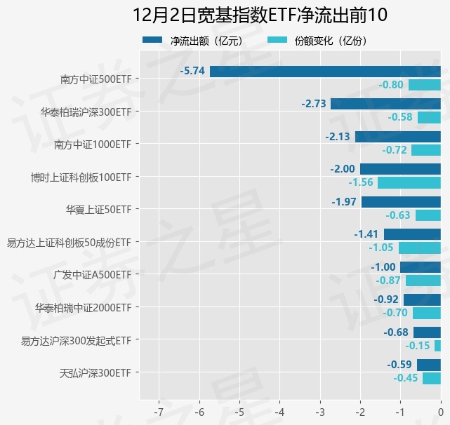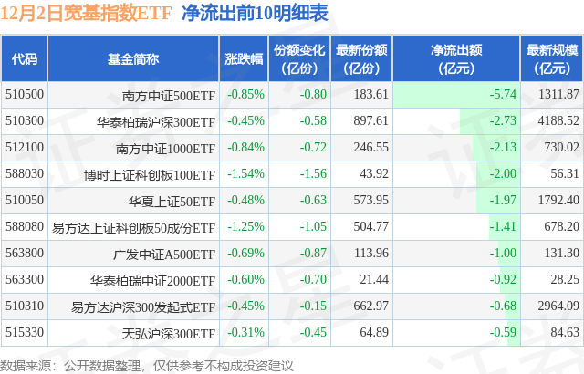 当日有57只宽基指数ETF基金出现资金净流出,其中净流出排首位的是南方中证500ETF(510500),份额减少了8040.0万份,净流出额为5.74亿元。