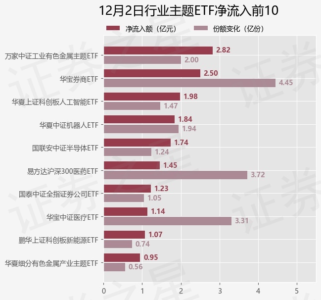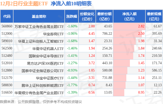 当日有94只行业主题ETF基金出现资金净流入,其中净流入排首位的是万家中证工业有色金属主题ETF(560860),份额增加了2.0亿份,净流入额为2.82亿元。