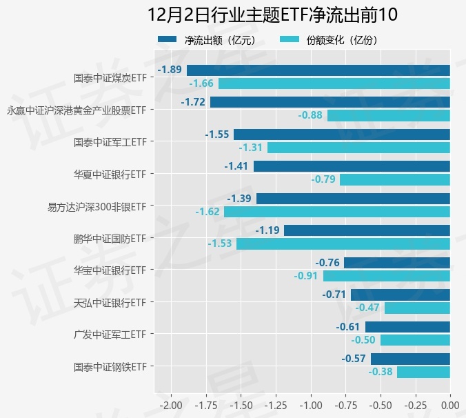 当日有87只行业主题ETF基金出现资金净流出,其中净流出排首位的是国泰中证煤炭ETF(515220),份额减少了1.67亿份,净流出额为1.89亿元。