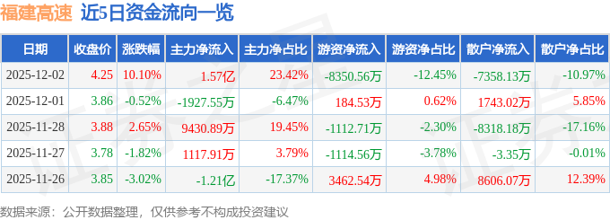 证券之星消息,截至2025年12月2日收盘,福建高速(600033)报收于4.25元,上涨10.1%,涨停,换手率6.0%,成交量164.53万手,成交额6.71亿元。