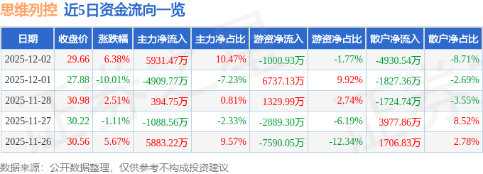 证券之星消息,截至2025年12月2日收盘,思维列控(603508)报收于29.66元,上涨6.38%,换手率5.17%,成交量19.73万手,成交额5.66亿元。