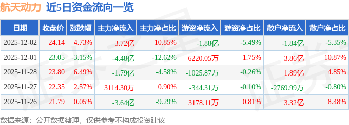 证券之星消息,截至2025年12月2日收盘,航天动力(600343)报收于24.14元,上涨4.73%,换手率22.44%,成交量143.22万手,成交额34.29亿元。