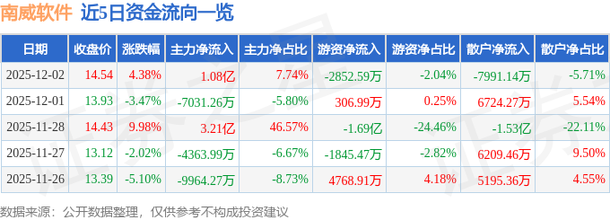 证券之星消息,截至2025年12月2日收盘,南威软件(603636)报收于14.54元,上涨4.38%,换手率16.84%,成交量97.74万手,成交额14.0亿元。