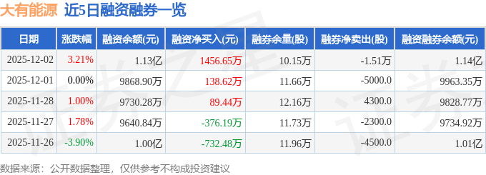 大有能源融资融券信息显示,融资方面,当日融资买入5217.81万元,融资偿还3761.16万元,融资净买入1456.65万元,连续3日净买入累计1684.71万元。融券方面,融券卖出2800.0股,融券偿还1.79万股,融券余量10.15万股,融券余额84.85万元。融资融券余额1.14亿元。