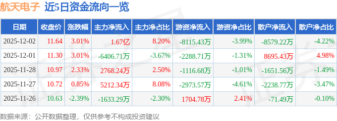 证券之星消息,截至2025年12月2日收盘,航天电子(600879)报收于11.64元,上涨3.01%,换手率5.34%,成交量176.29万手,成交额20.35亿元。