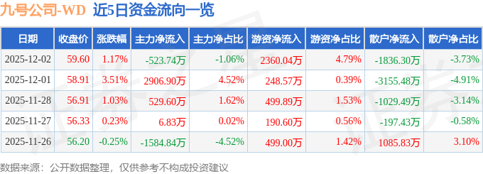 证券之星消息,截至2025年12月2日收盘,九号公司(689009)报收于59.6元,上涨1.17%,换手率1.5%,成交量8.27万手,成交额4.93亿元。