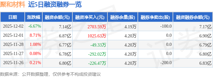 聚和材料融资融券信息显示,融资方面,当日融资买入9342.69万元,融资偿还6639.1万元,融资净买入2703.59万元。融券方面,融券卖出200.0股,融券偿还300.0股,融券余量4.19万股,融券余额227.35万元。融资融券余额7.17亿元。