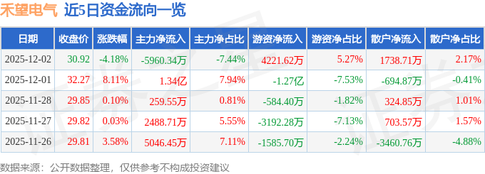 证券之星消息,截至2025年12月2日收盘,禾望电气(603063)报收于30.92元,下跌4.18%,换手率5.62%,成交量25.74万手,成交额8.01亿元。