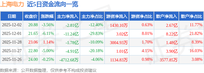 证券之星消息,截至2025年12月2日收盘,上海电力(600021)报收于20.88元,下跌3.56%,换手率3.86%,成交量108.86万手,成交额22.68亿元。