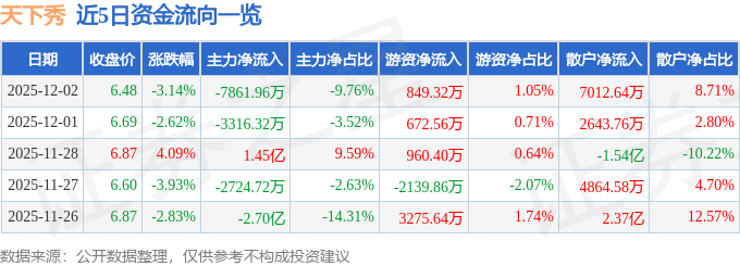 证券之星消息,截至2025年12月2日收盘,天下秀(600556)报收于6.48元,下跌3.14%,换手率6.89%,成交量124.48万手,成交额8.05亿元。