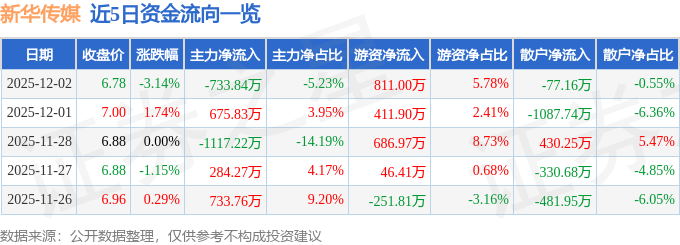 证券之星消息,截至2025年12月2日收盘,新华传媒(600825)报收于6.78元,下跌3.14%,换手率1.97%,成交量20.58万手,成交额1.4亿元。