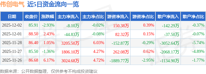 证券之星消息,截至2025年12月2日收盘,伟创电气(688698)报收于85.91元,下跌2.93%,换手率2.09%,成交量4.46万手,成交额3.83亿元。