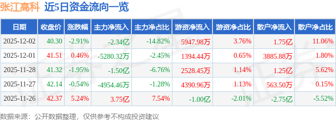 证券之星消息,截至2025年12月2日收盘,张江高科(600895)报收于40.3元,下跌2.91%,换手率2.52%,成交量39.06万手,成交额15.82亿元。