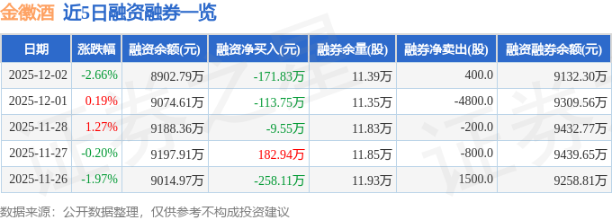 金徽酒融资融券信息显示,融资方面,当日融资买入458.49万元,融资偿还630.32万元,融资净偿还171.83万元。融券方面,融券卖出900.0股,融券偿还500.0股,融券余量11.39万股,融券余额229.51万元。融资融券余额9132.3万元。