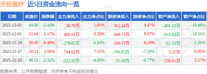 证券之星消息,截至2025年12月2日收盘,天臣医疗(688013)报收于49.8元,下跌2.43%,换手率0.94%,成交量7625.0手,成交额3825.89万元。