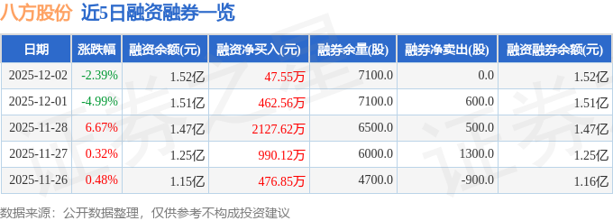 八方股份融资融券信息显示,融资方面,当日融资买入1482.46万元,融资偿还1434.91万元,融资净买入47.55万元,连续3日净买入累计2637.72万元。融券方面,融券卖出0.0股,融券偿还0.0股,融券余量7100.0股,融券余额22.32万元。融资融券余额1.52亿元。