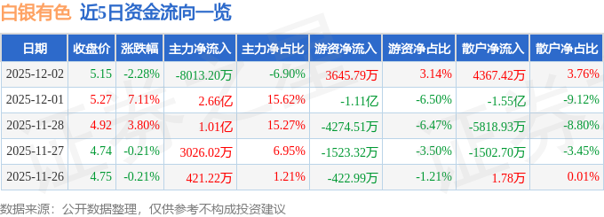 证券之星消息,截至2025年12月2日收盘,白银有色(601212)报收于5.15元,下跌2.28%,换手率3.04%,成交量225.1万手,成交额11.61亿元。