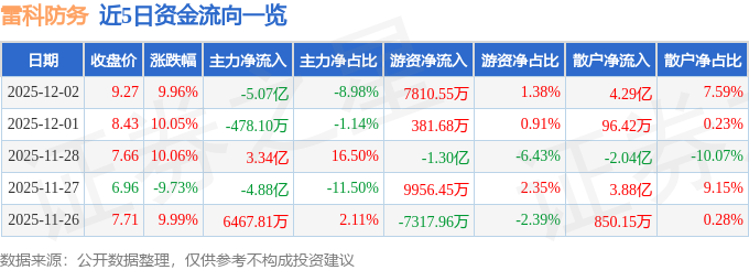 证券之星消息,截至2025年12月2日收盘,雷科防务(002413)报收于9.27元,上涨9.96%,已连续涨停3天,换手率49.17%,成交量635.81万手,成交额56.42亿元。