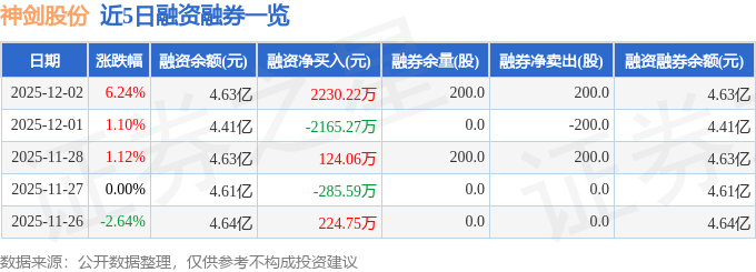 神剑股份融资融券信息显示,融资方面,当日融资买入7543.78万元,融资偿还5313.56万元,融资净买入2230.22万元。融券方面,融券卖出200.0股,融券偿还0.0股,融券余量200.0股,融券余额0.14万元。融资融券余额4.63亿元。
