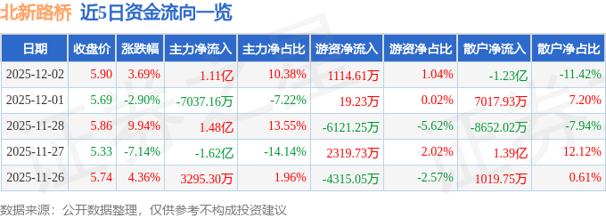 证券之星消息,截至2025年12月2日收盘,北新路桥(002307)报收于5.9元,上涨3.69%,换手率14.52%,成交量184.1万手,成交额10.74亿元。