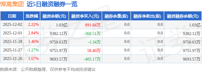 悍高集团融资融券信息显示,融资方面,当日融资买入2111.78万元,融资偿还1219.94万元,融资净买入891.84万元。融券方面,融券卖出0.0股,融券偿还0.0股,融券余量0.0股,融券余额0.0万元。融资融券余额1.03亿元。