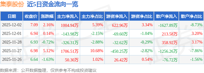 证券之星消息,截至2025年12月2日收盘,集泰股份(002909)报收于7.09元,上涨2.16%,换手率6.9%,成交量26.26万手,成交额1.86亿元。
