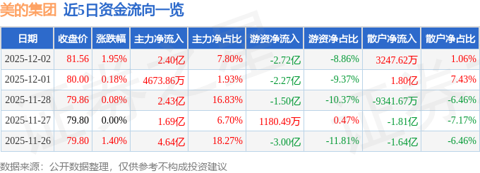 证券之星消息,截至2025年12月2日收盘,美的集团(000333)报收于81.56元,上涨1.95%,换手率0.55%,成交量37.8万手,成交额30.72亿元。