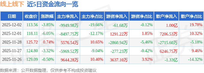 12月2日的资金流向数据方面,主力资金净流出9949.98万元,占总成交额19.66%,游资资金净流出61.68万元,占总成交额0.12%,散户资金净流入1.0亿元,占总成交额19.78%。