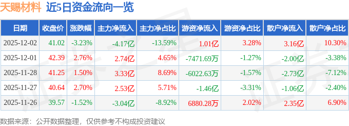 证券之星消息,截至2025年12月2日收盘,天赐材料(002709)报收于41.02元,下跌3.23%,换手率5.05%,成交量74.38万手,成交额30.68亿元。