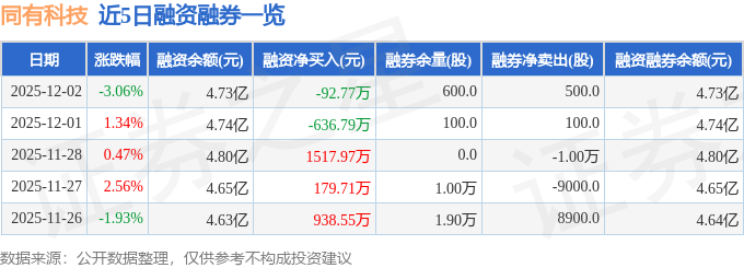 同有科技融资融券信息显示,融资方面,当日融资买入2619.16万元,融资偿还2711.92万元,融资净偿还92.77万元。融券方面,融券卖出500.0股,融券偿还0.0股,融券余量600.0股,融券余额1.14万元。融资融券余额4.73亿元。