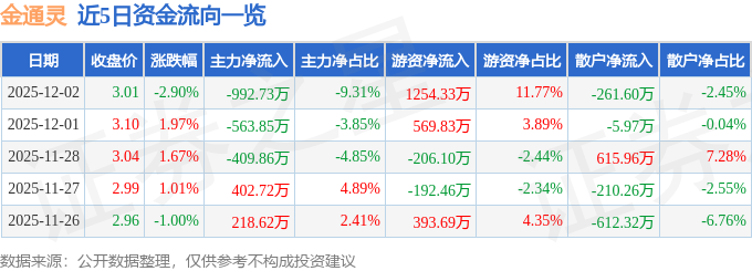 证券之星消息,截至2025年12月2日收盘,金通灵(300091)报收于3.01元,下跌2.9%,换手率2.4%,成交量35.37万手,成交额1.07亿元。