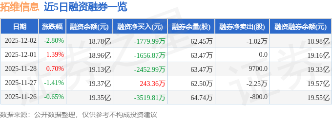 拓维信息融资融券信息显示,融资方面,当日融资买入5958.38万元,融资偿还7738.37万元,融资净偿还1779.99万元。融券方面,融券卖出3300.0股,融券偿还1.35万股,融券余量62.45万股,融券余额1949.0万元。融资融券余额18.98亿元。