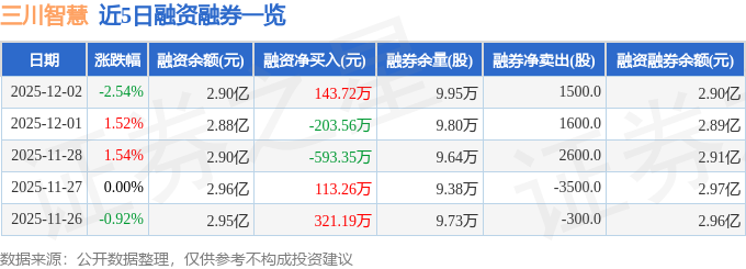 三川智慧融资融券信息显示,融资方面,当日融资买入1674.02万元,融资偿还1530.3万元,融资净买入143.72万元。融券方面,融券卖出2000.0股,融券偿还500.0股,融券余量9.95万股,融券余额64.87万元。融资融券余额2.9亿元。