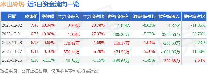 证券之星消息,截至2025年12月2日收盘,冰山冷热(000530)报收于7.45元,上涨10.04%,已连续涨停2天,换手率26.68%,成交量160.07万手,成交额11.5亿元。