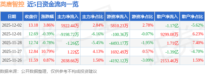 12月2日的资金流向数据方面,主力资金净流入5922.44万元,占总成交额2.84%,游资资金净流入5810.23万元,占总成交额2.78%,散户资金净流出1.17亿元,占总成交额5.62%。