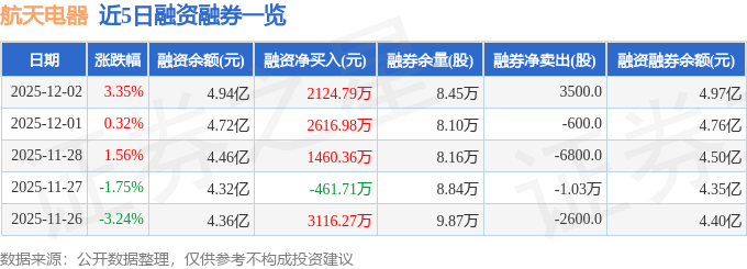 航天电器融资融券信息显示,融资方面,当日融资买入9062.03万元,融资偿还6937.24万元,融资净买入2124.79万元,连续3日净买入累计6202.13万元。融券方面,融券卖出1.64万股,融券偿还1.29万股,融券余量8.45万股,融券余额359.97万元。融资融券余额4.97亿元。