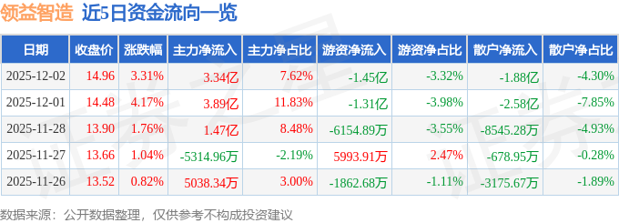 12月2日的资金流向数据方面,主力资金净流入3.34亿元,占总成交额7.62%,游资资金净流出1.45亿元,占总成交额3.32%,散户资金净流出1.88亿元,占总成交额4.3%。