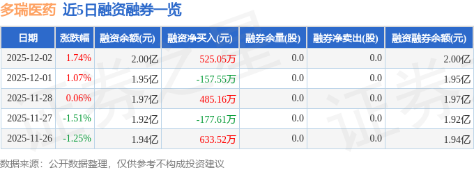 多瑞医药融资融券信息显示,融资方面,当日融资买入1580.73万元,融资偿还1055.68万元,融资净买入525.05万元。融券方面,融券卖出0.0股,融券偿还0.0股,融券余量0.0股,融券余额0.0万元。融资融券余额2.0亿元。